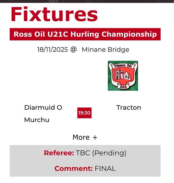 Ross Oil SE U21 C Hurling Final: Tuesday November 18th Diarmuid Ó Murchús v @TractonGAAClub in Minane Bridge at 7:30pm Entry is €5. CASH ONLY at the gate